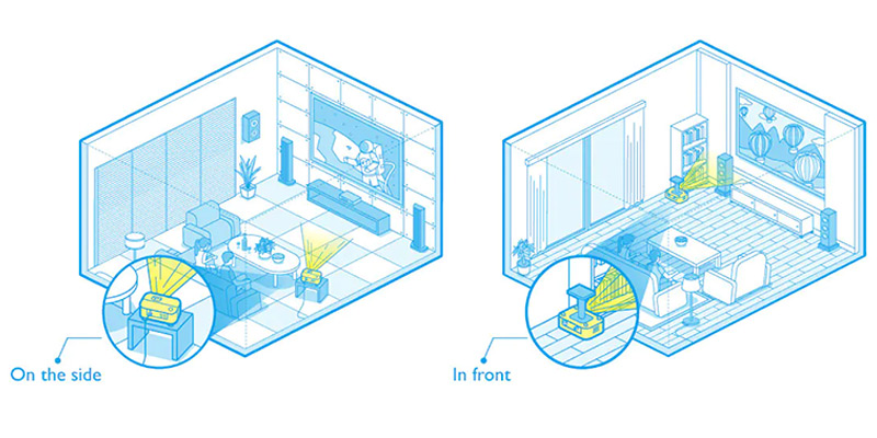 Để có trải nghiệm xem phim thú vị và thoải mái nhất, điều quan trọng thứ 2 là xem xét cách sử dụng không gian ngoài kích thước phòng. Tùy thuộc vào cách bố trí đồ nội thất và cách gia đình bạn di chuyển trong phòng, có thể thuận tiện hơn khi đặt máy chiếu sang trái hoặc bên phải màn hình để tránh các vật cản trong đường chiếu và để cho gia đình bạn tự do di chuyển.
