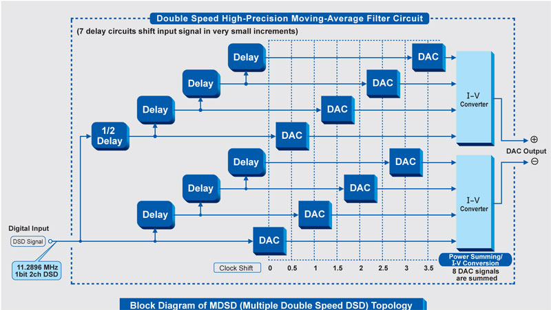 - Xử lý kỹ thuật số đột phá: MDSD (DSD cho khả năng xử lý tín hiệu nhanh gấp đôi các mạch xử lý khác) với sự hỗ trợ cho 11.2896 MHz (DSD 1 kênh 2 bit).