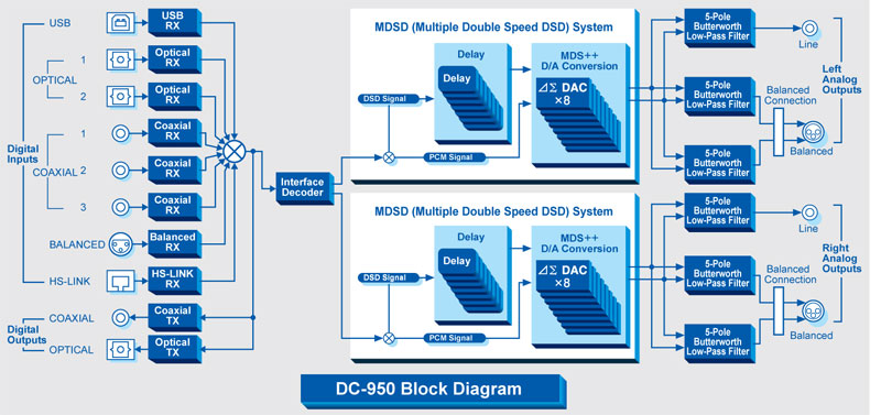 Bộ chuyển đổi D / A loại MDS ++ với 8 mạch song song và hỗ trợ 384 kHz (PCM 2 kênh 32 bit) được tích hợp trên Accuphase DC-950. Bộ chuyển đổi D / A loại MDS ++ siêu tiên tiến này được sử dụng trong DC-950 được phát triển để đẩy mạnh hơn nữa, dẫn đến hiệu suất ngoạn mục và tái tạo tín hiệu PCM ở mức cao nhất. Tiên phong ứng dụng chip DAC Hyperux ™ 32 bit mới nhất (ES9038PRO) của ESS Technology Inc., một giải pháp điều khiển song song tám mạch đã được triển khai thành công. So với một mạch chuyển đổi đơn, sự sắp xếp này cải thiện hiệu suất tổng thể theo hệ số khoảng ba.