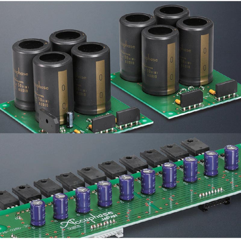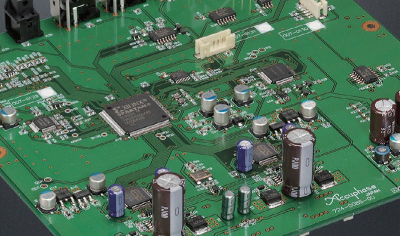 Bộ lọc khuếch đại bảng mạch in trên DAC Accuphase DC-950 được làm từ nhựa fluorocarbon vải thủy tinh với hằng số điện môi thấp và tổn thất tối thiểu.