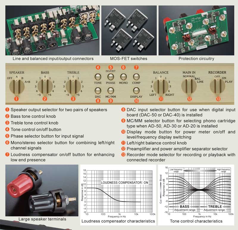 Ba giai đoạn đầu ra kéo đẩy song song với MOS-FET công suất nổi tiếng về chất lượng âm thanh cao.