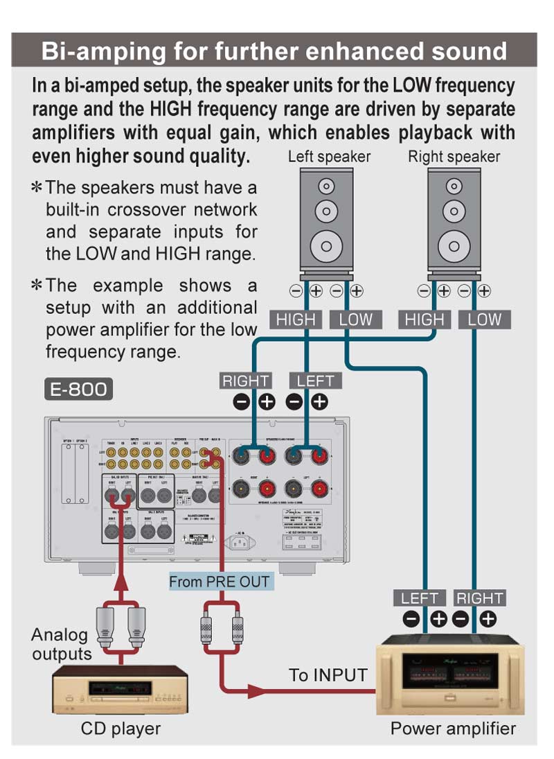 E-800 có phần tiền khuếch đại hoàn hảo với điều khiển âm lượng công nghệ AAVA cân bằng, trong khi phần khuếch đại công suất được cấu hình là bộ khuếch đại thiết bị sử dụng cấu hình kéo đẩy song song sáu lần của MOS-FET trên mạch công suất Class A - thuần túy, chất lượng hoàn hảo ngang bằng với các bộ khuếch đại loại riêng biệt cao cấp hàng tỷ đồng.