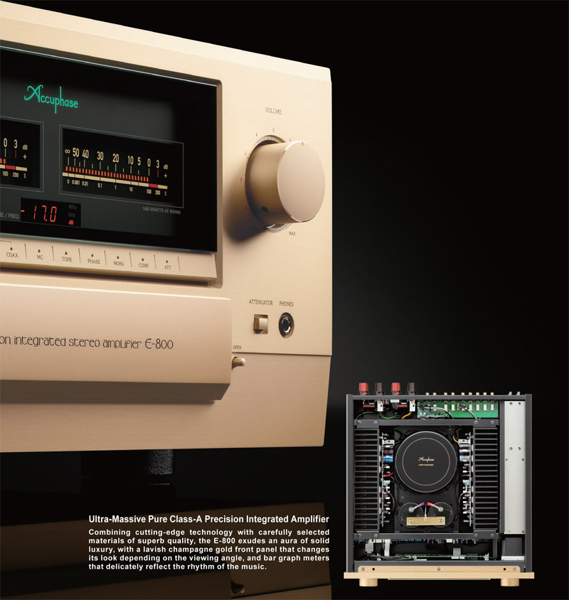 Kể từ khi ra mắt E-530 vào năm 2002, bộ khuếch đại tích hợp Class A của hãng Accuphase được các audiophiles đánh giá là các model hàng đầu trong phân khúc amply Hiend cao cấp trên thế giới hiện nay. Model E-800 được cải tiến cải tiến là model amply hiend sử dụng mạch công suất Class-A hoàn toàn mới được tích hợp mang lại công suất đầu ra mạnh mẽ tốt hơn.
