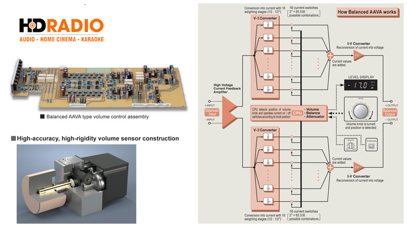 AAVA thực hiện điều chỉnh âm lượng bằng cách sử dụng kết hợp 16 tín hiệu hiện tại với cường độ khác nhau, do đó loại bỏ tín hiệu suy thoái và biến động trở kháng và duy trì tỷ lệ S / N cao và THD thấp trên toàn bộ phạm vi âm lượng. Trong AAVA cân bằng