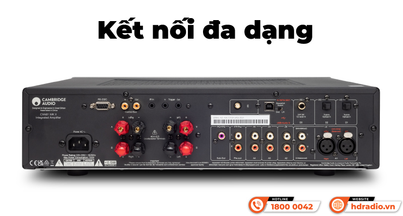 Amply Cambridge Audio CXA81 MKII được trang bị đa dạng đầu vào ở mặt sau như: đầu vào kỹ thuật số TOSLINK, đầu vào âm thanh đồng trục và USB, đầu vào XLR cân bằng cho kết nối cao cấp giúp bạn kết nối với nhiều nguồn âm thanh khác nhau. Ngoài ra, kết nối Bluetooth aptX HD cho phép ghép nối không dây liền mạch với các thiết bị tương thích, mang lại sự tiện lợi mà không ảnh hưởng đến chất lượng âm thanh.