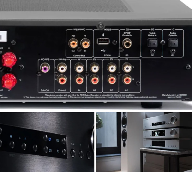 Cách kết nối kỹ thuật số ở dạng đầu vào kỹ thuật số đồng trục S / PDIF và TOSLINK. Thêm một dongle Bluetooth BT100 tùy chọn và bạn có quyền truy cập vào phát trực tuyến chất lượng cao aptX, mở ra thế giới khả năng không dây từ thiết bị được ghép nối của bạn. Các tùy chọn tương tự bao gồm bốn bộ đầu vào RCA và một giắc cắm aux 3,5 mm phía trước để bạn cũng được đáp ứng đầy đủ.