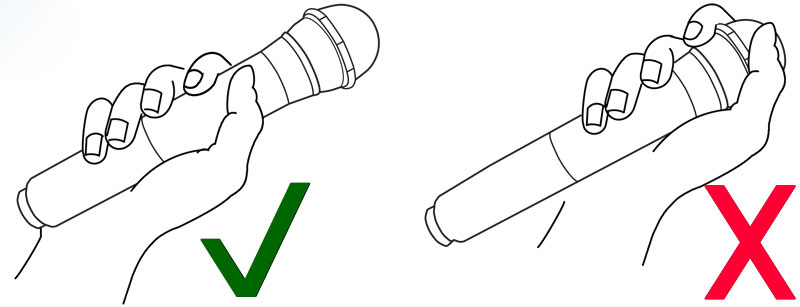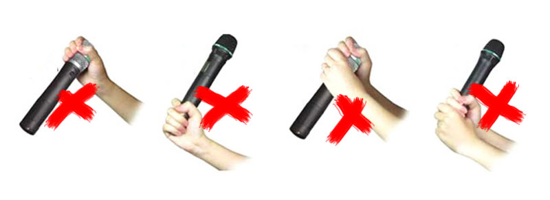 Không nên cầm lưới chụp của micro, cầm vào đầu chụp míc chẳng khác nào bạn đang bịt miệng mình nếu bạn để tay vòng qua lưới sắt, giọng hát của bạn sẽ bị tác động và biến đổi nghiêm trọng, âm thanh đi tới bàn tay sẽ bị dội lại Micro tạo ra tiếng vang rất khó chịu.