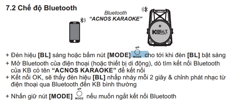 Còn nếu không sáng, đứng loa làm tiếp theo hướng dấn sau: nếu loa có nút bluetooth hoặc nút có ký hiệu bluetooth bên dưới, nhấn vào và mở chế độ bluetooth cho loa; nếu loa không thấy có nút bluetooth nhưng lại có "nút mode - thường có ký hiệu mũi tên trái phải đối lập nhau" nhấn nút đó để chuyển sang chế độ BL - ghi tắt của bluetooth ( như trên Loa kéo Acnos KB39U)