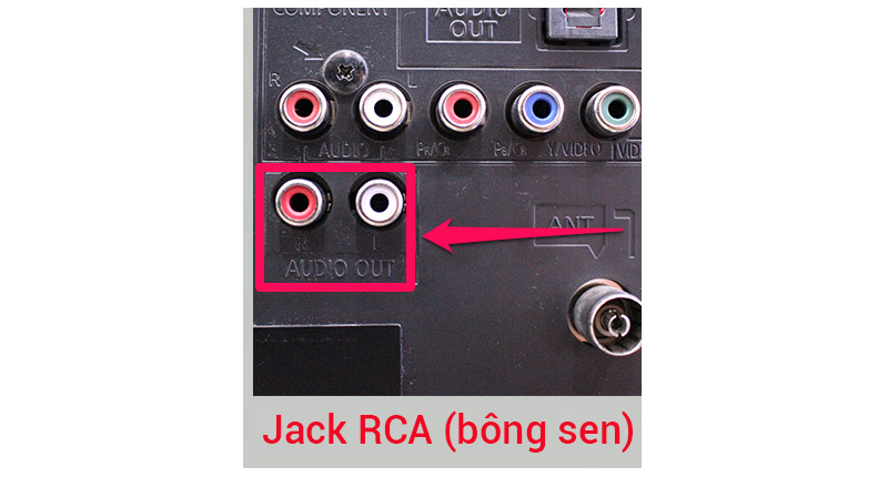 - Bước 1: Bật nguồn loa kéo, cắm 1 đầu (2 giắc: trắng, đỏ) vào cổng Audio Out trên thiết bị nguồn phát tivi, đầu karaoke