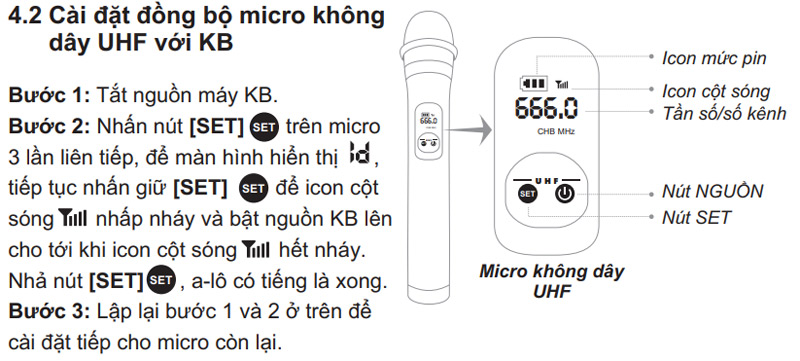 + Khi có hiện tượng mất tiếng, trùng tần số micro, chỉ cần nhấn nút [SET] trên micro để đổi kênh (CH) sang tần số khác, máy sẽ tự động đồng bộ trở lại