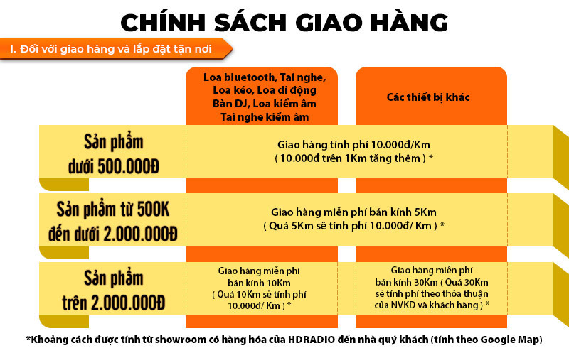 - Khoảng cách được tính từ showroom có hàng hóa của HDRADIO đến nhà quý khách (tính theo google map)