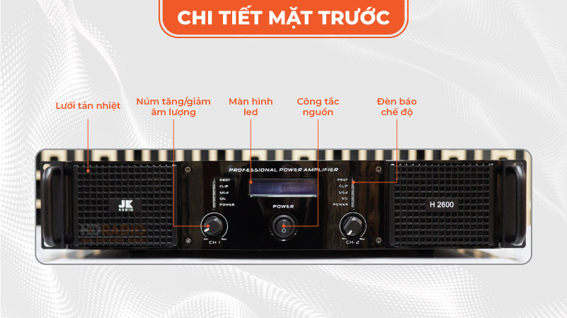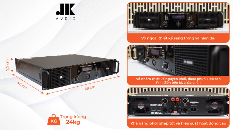 Cũng sử dụng mạch công suất class H cho ra âm thanh rõ ràng, chân thực, JK H2600 còn là model được cải tiến hơn so với cục đẩy jk 2400 trước đó mạnh mẽ hơn về công suất nhằm phù hợp với nhiều diện tích phòng hát khác nhau. Phối ghép đa dạng với các dòng loa karaoke hiện nay trên thị trường.