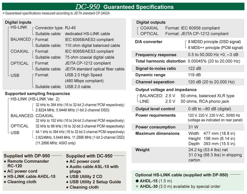 Accuphase DP-950 và DC-950 là hệ thống nhận tín hiệu CD/SACD sau đó xử lý chuyển đổi tín hiệu từ digital sang analog hoàn hảo chính xác, high end trước khi đến các amply nghe nhạc. Hệ thống có thể nhận cũng như xử lý hoàn hảo âm thanh của đa số các loại đĩa CD nhạc cao cấp nhất hiện nay trên thế giới. DP-950 và DC-950 của hãng Accuphase được rất nhiều AudioPhile trên toàn thế giới ưa thích sử dụng cho dàn high end của mình bởi chất lượng vượt trộii của chúng.