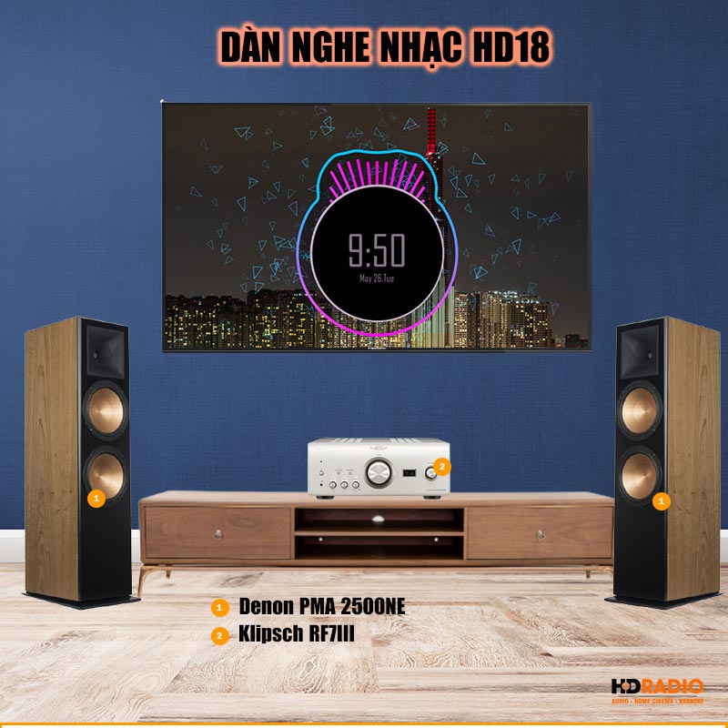 Dàn âm thanh nghe nhạc HD18 là dàn âm thanh nghe nhạc hay nhất kết hợp hoàn hảo giữa Amply Denon PMA 2500NE (Xuất Xứ Nhật Bản) với cặp Loa Klipsch RF7 III được các kỹ thuật viên ưu tú của HDRADIO đưa ra cấu hình thiết kế và thử nghiệm hoàn hảo tại phòng demo chuyên dụng của công ty. Dàn nghe nhạc cao cấp này cho âm thành gần như hoàn hảo với tất cả các thể loại nhạc từ trữ tình đến nhạc bolero hay nhạc vàng .trong khoảng không gian từ 25 - 40 mét vuông