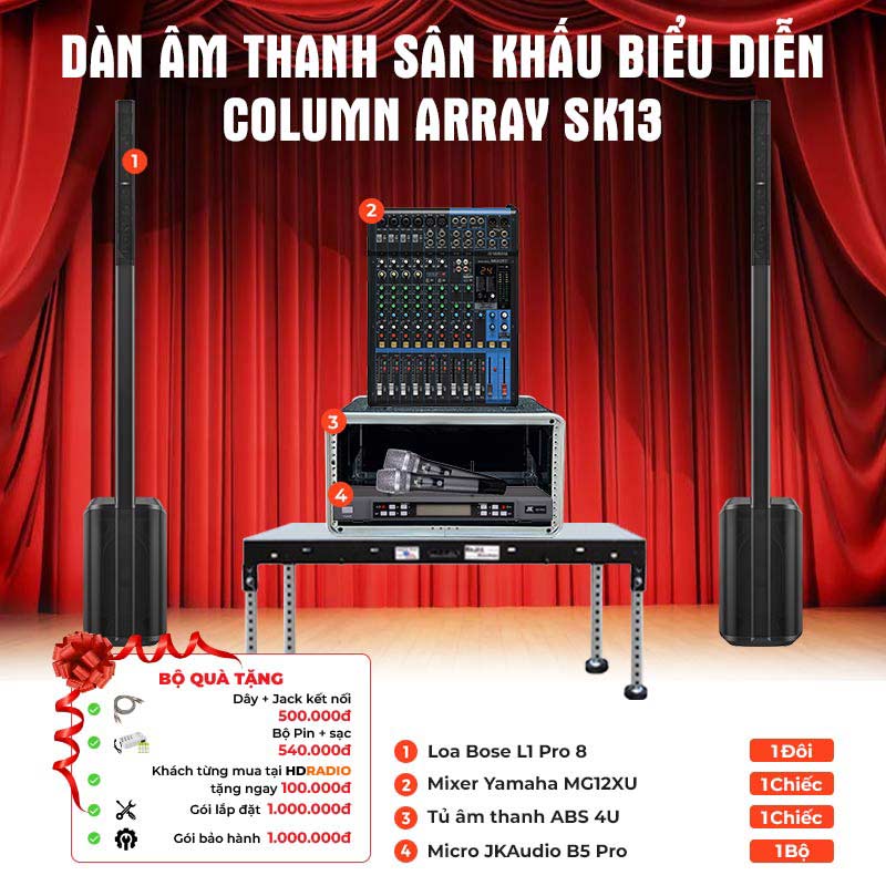 Dàn âm thanh sân khấu biểu diễn Column Array SK13 là hệ thống âm thanh chuyên dụng chất lượng cao có thể đáp ứng hoàn hảo cho các không gian sân khấu biểu diễn có quy mô diện tích trong khoảng từ 50-100m2 được tạo nên bởi sự góp mặt của các thiết bị âm thanh chất lượng cao mang các thương hiệu đã nổi tiếng trên thị trường như: Bose, JKAudio, Soundcraft và tủ đựng chất lượng. Cụ thể các sản phẩm thuộc hệ thống âm thanh này bao gồm: