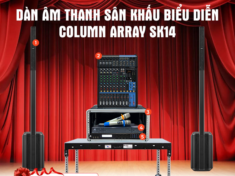 Dàn âm thanh sân khấu biểu diễn Column Array SK14 là hệ thống âm thanh chuyên dụng dành cho các không gian sản khấu biểu diễn có quy mô diện tích trong khoảng từ 50-100m2 được tạo nên bởi sự góp mặt của các thiết bị âm thanh cao cấp đến từ những  thương hiệu nổi tiếng JKaudio, Bose, Soundcraft cùng tủ đựng chất lượng cao. Các sản phẩm của dàn âm thanh sân khấu biểu diễn này bao gồm:
