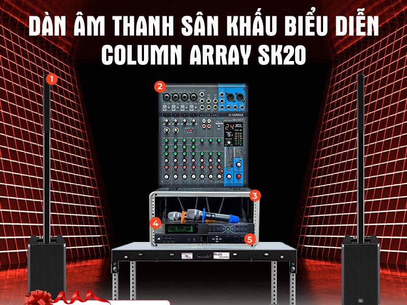 Dàn âm thanh sân khấu biểu diễn Column Array SK20 là hệ thống âm thanh chuyên dụng có thể đáp ứng hoàn hảo cho các không gian sân khấu biểu diễn có quy mô diện tích trong khoảng từ 50-100m2 được tạo nên bởi sự góp mặt của các thiết bị âm thanh chất lượng cao mang các thương hiệu đã nổi tiếng trên thị trường như: Yamaha, JKAudio, Soundcraft và tủ đựng chất lượng. Cụ thể các sản phẩm thuộc hệ thống âm thanh này bao gồm: