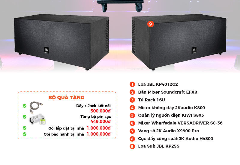 Đánh giá Dàn âm thanh sân khấu biểu diễn PUB-LOUNGE SK36 (JBL KP4012G2, Sub JBL KP25S, JKAudio H4800, JKAudio X9900 pro, Wharfedale VERSADRIVER SC-36, Soundcraft EFX8, JKAudio K800, KIWI S803, Tủ Rack 16U)