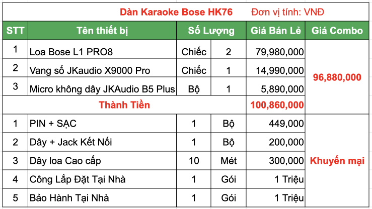 Dàn Karaoke Bose HK76 được xây dựng hoàn chỉnh bởi ba thiết bị âm thanh, bao gồm: Loa Bose L1 Pro 8, Vang Số JKaudio X9000 Pro và bộ Micro không dây JKAudio B5 Plus. Sở hữu cấu hình âm thanh đơn giản, trong đó mỗi thiết bị đóng những vai trò riêng biệt, tuy nhiên, khi kết hợp với nhau tạo nên một bộ dàn karaoke gia đình ấn tượng, với chất âm trong trẻo, mượt mà, làm người nghe khó cưỡng lại được.