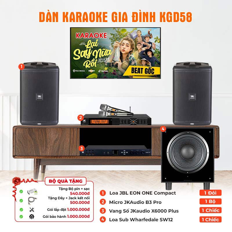 Dàn karaoke gia đình KGD58 (JBL Eon One Compact, JKAudio X6000 Plus, B3 Pro, sub Wharfedale SW12) Dàn karaoke gia đình KGD58 (JBL Eon One Compact, JKAudio X6000 Plus, B3 Pro, sub Wharfedale SW12)