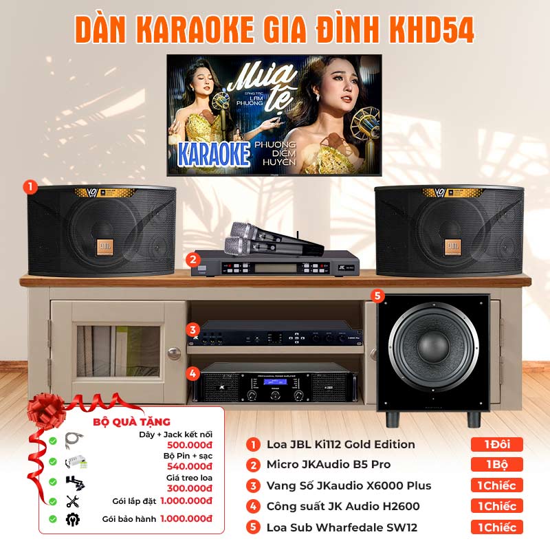 Đánh giá Dàn karaoke gia đình KHD54 (JBL Ki112 Gold Edition, JKAudio H2600, JKaudio X6000 Plus, JKAudio B5 Pro, Sub Wharfedale SW12)