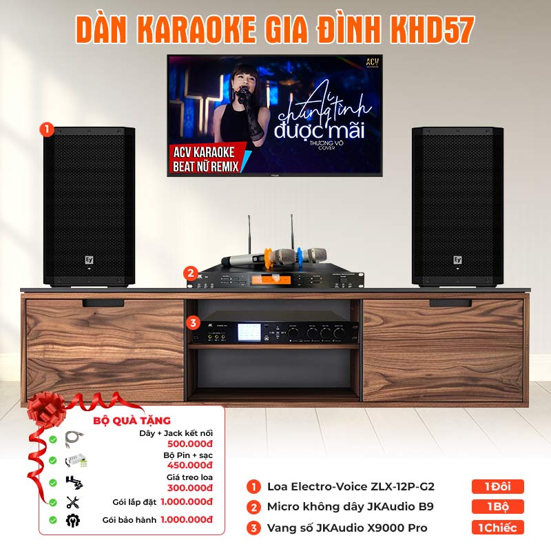 Dàn karaoke gia đình KHD57 là bộ dàn hát karaoke lý tưởng được thiết kế để sử dụng trong không gian phòng từ 20 đến 35 mét vuông. Với thiết kế nhỏ gọn nhưng mang đến chất lượng âm thanh ấn tượng, mạnh mẽ và bùng nổ, bộ dàn amply karaoke chắc chắn sẽ chinh phục trái tim bạn ngay từ những nốt nhạc đầu tiên. Được phối ghép hoàn hảo bởi các thiết bị âm thanh karaoke hiện đại đến từ hai thương hiệu danh tiếng là Electro Voice và JKAudio, dàn KHD57 chắc chắn sẽ là sự lựa chọn hoàn hảo cho những buổi tiệc gia đình, họp mặt bạn bè hay những dịp kỷ niệm đặc biệt.