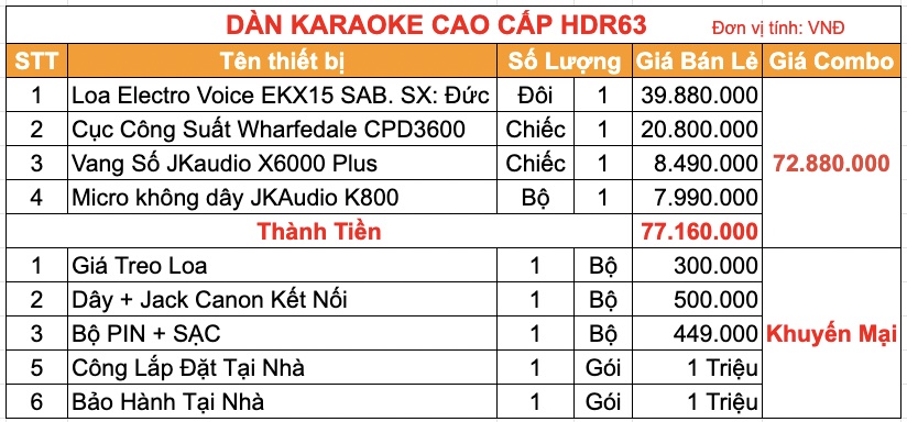 HDRadio xin trân trọng giới thiệu đến các bạn Bộ Dàn Karaoke cap cấp HDR63 - Được thiết kế, phối ghép từ những thiết bị âm thanh chính hãng đến từ nhiều thương hiệu danh tiếng trên thế giới như JKaudio, Wharfedale, Electro Voice...Được đánh giá là một trong những hệ thống âm thanh chuyên nghiệp sở hữu cấu hình mạnh mẽ, đẹp mắt, âm thanh ấn tượng, dàn karaoke tiêu chuẩn tự tin là sự lựa chọn quá lý tưởng cho không gian ca hát, giải trí tại gia của bạn với khả năng trình diễn hoàn hảo.