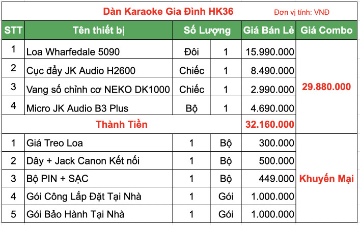 Trải nghiệm ca hát tại gia giờ đây trở nên tiện lợi và chuyên nghiệp hơn với Dàn karaoke Wharfedale HK36 đến từ HDRadio chúng tôi. Được thiết kế chỉnh chu với sự chọn lọc và tính toán kỹ lưỡng, phối ghép bởi các thiết bị âm thanh cao cấp đến từ nhiều thương hiệu nổi tiếng như Wharfedale. JKaudio, Neko, dàn karaoke HK36 tự tin chinh phục yêu cầu khắt khe từ khách hàng cũng như đa dạng các không gian phòng khác nhau. Với cấu hình đẹp mắt, sang trọng cùng khả năng trình diễn âm thanh ấn tượng, bộ dàn này hứa hẹn sẽ mang đến cho bạn những trải nghiệm hát ca tại gia đáng giá nhất!