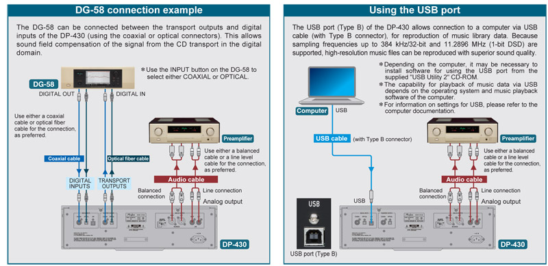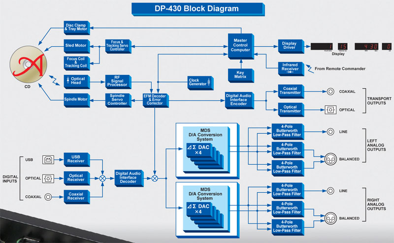 Đầu CD Accuphase DP430 có đầu ra tương tự cung cấp sự lựa chọn về mức độ đường và cân bằng các loại để loại bỏ nhiễu bên ngoài. Mạch kỹ thuật số đầy đủ để điều khiển cơ chế.