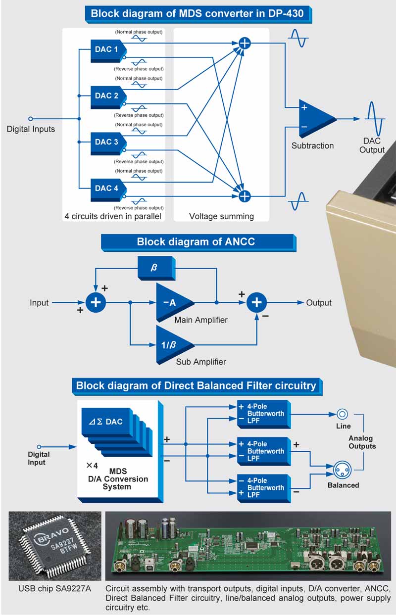 Đầu CD Accuphase DP430 được tích hợp Bộ chuyển đổi D / A loại MDS chất lượng. Bốn mạch D / A hiệu suất cao AK4490EQ chip chuyển đổi được sản xuất bởi Asahi Kasei Microdevices cho âm thanh hoàn hảo