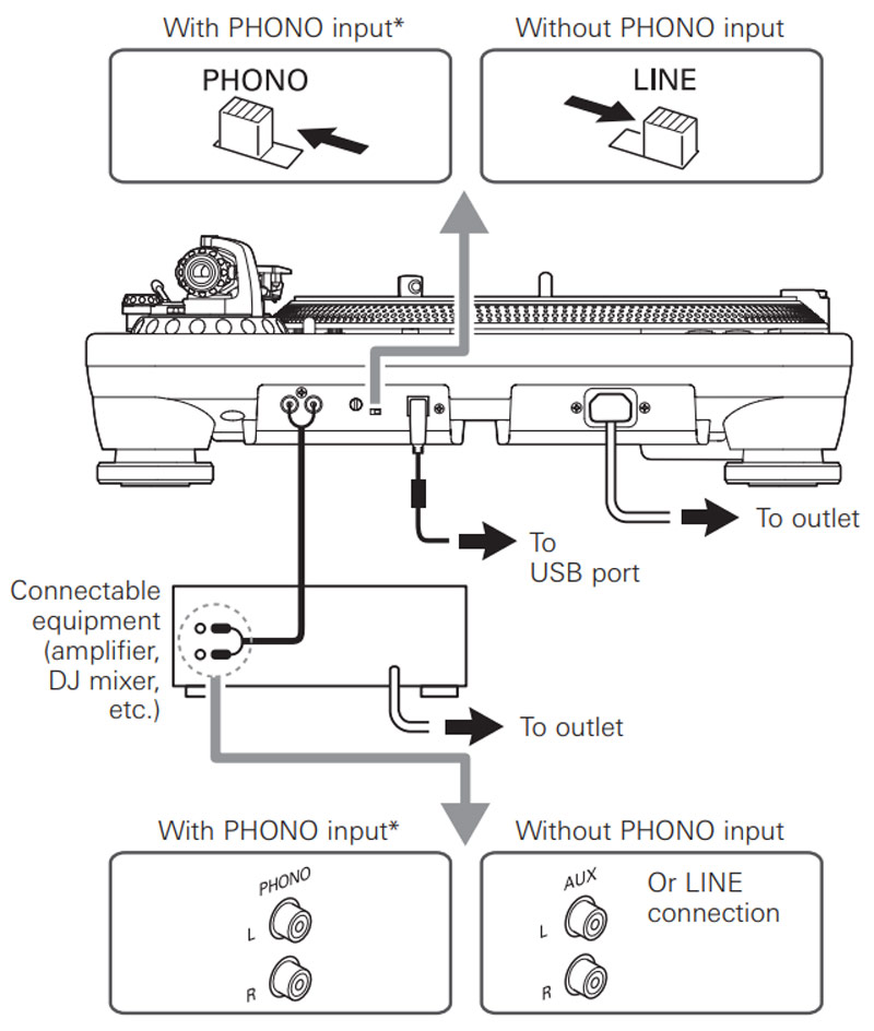 Đầu đĩa than Audio Technica AT-LP1240-USBXP có khả năng kết nối dễ dàng với nhiều loại amply nghe nhạc, pre amply, amply DJ, Mixer hay các thiết bị âm thanh khác thông qua mạch pre-amp phono có thể chuyển đổi tích hợp bên trong cùng cần gạt lựa chọn phía sau.