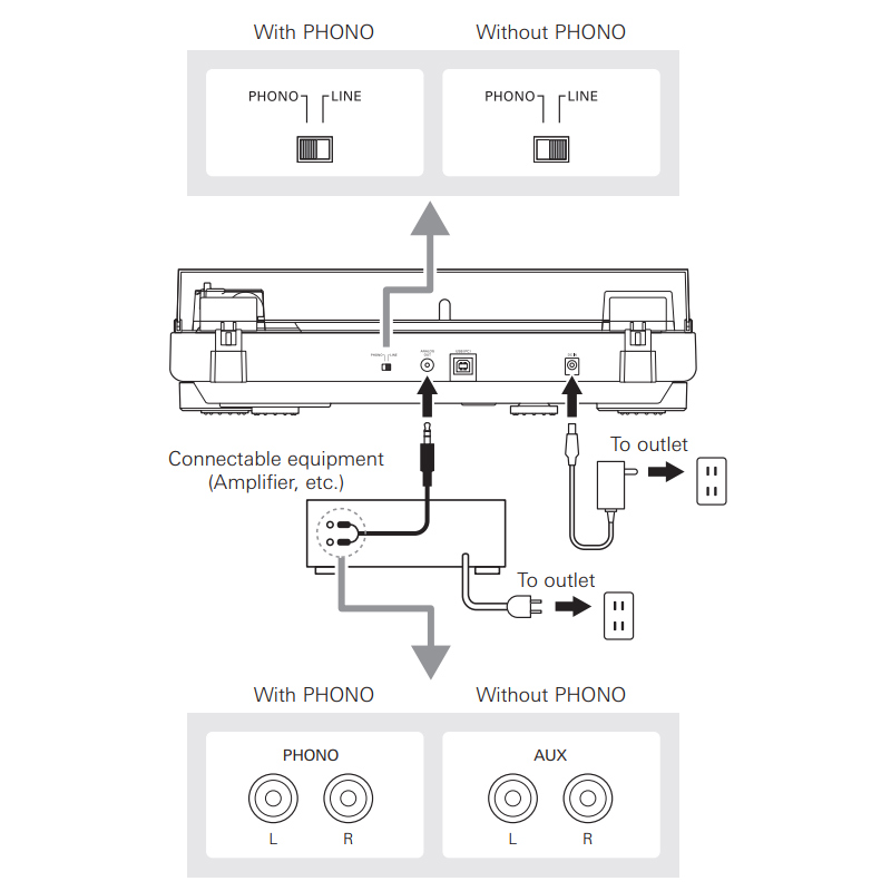 • Bộ khuếch đại tiền phono tích hợp có thể chuyển đổi cho đầu ra phono hoặc line-level output
