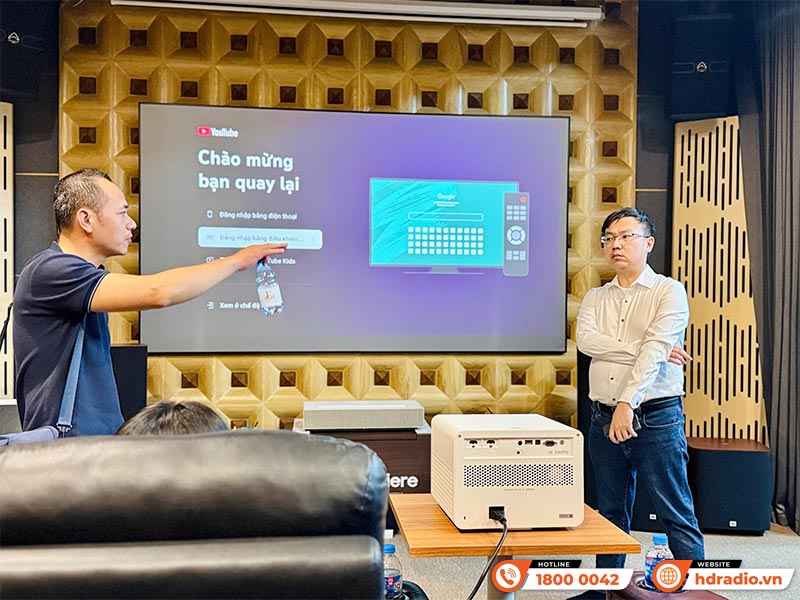 Đoàn đại diện BenQ cũng đã trực tiếp tham quan phòng trải nghiệm máy chiếu tại showroom HDRadio. Các sản phẩm của thương hiệu đều được thiết kế và bố trí trong không gian trải nghiệm rất khoa học. Đại diện BenQ bày tỏ sự hài lòng về cách HDRadio thiết kế cũng như vận hành khu demo mang tính thực tế cao. Từ đó, quý khách hàng có thể trải nghiệm thực tế sản phẩm để từ đó đưa ra quyết định lựa chọn sản phẩm phù hợp với nhu cầu của bản thân.