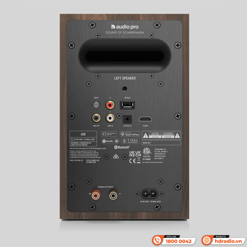 Loa AudioPro A28 hỗ trợ kết nối đa dạng với các cổng kết nối được bố trí ở mặt sau loa, gồm có cổng: HDMI, Optical, RCA Analog và một cổng RCA Subwoofer Output để kết nối với Sub điện rời. Khả năng kết nối không dây WiFi giúp A28 giải mã toàn vẹn chất lượng âm thanh Lossless lên đến 24-bit, vượt trội hoàn toàn so với các giải pháp loa Bluetooth truyền thống. Tuy nhiên, loa vẫn hỗ trợ kết nối Bluetooth cho các trường hợp cần kết nối nhanh chóng.
