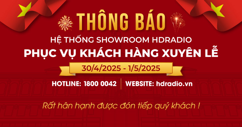 Những ngày cuối tháng Tư, đồng bào cả nước cùng nhau nhớ về một mốc son chói lọi trong lịch sử dân tộc. 50 năm trôi qua, tinh thần đoàn kết, lòng yêu nước và niềm tự hào vẫn luôn cháy mãi trong tim mỗi người dân Việt Nam. Nhằm phục vụ nhu cầu mua sắm thiết bị âm thanh của người dân trong dịp lễ 30/4 & 1/5 một cách chu đáo nhất, HDRadio rất vui khi tiếp tục được đồng hành cùng quý khách trong dịp lễ đặc biệt này. Chúng tôi sẽ phục vụ xuyên suốt dịp lễ không nghỉ để mang đến những trải nghiệm trọn vẹn và ý nghĩa nhất. Chúc quý khách và gia đình có một mùa lễ ngập tràn niềm vui và kỉ niệm!