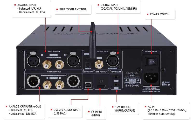 Headphone Amp + DAC + Pre Amply + DAC USB Cocktail HA500H-SR cho khả năng kết nối rất cao. Vì nó cung cấp Đầu vào Analog (Cân bằng và Không cân bằng), Đầu vào Kỹ thuật số (Đồng trục, Toslink, AES / EBU), Đầu vào I²S (HDMI) và Đầu vào Âm thanh USB, bạn có thể kết nối các thiết bị nguồn khác nhau với HA500H gần như không giới hạn. Đặc biệt, HA500H có thể kết nối hoàn hảo với I²S HDMI Ouput của X50Pro và X50D để phát Native DSD, MQA và PCM lên đến 384Khz với chất lượng âm thanh tuyệt vời.