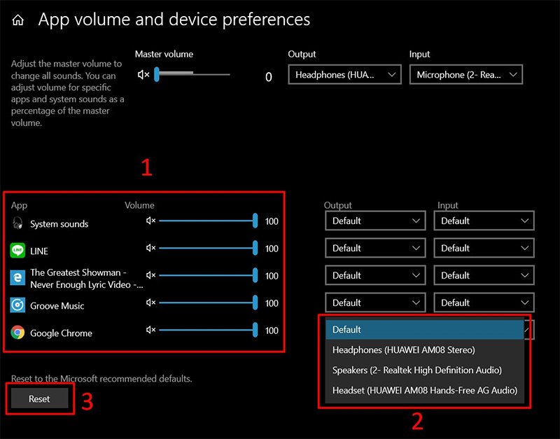 • 2. Tại cột Output, bạn chọn thiết bị phát là tai nghe hoặc loa (Default là mặc định).