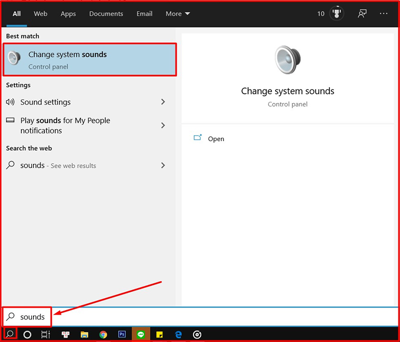 Bước 1: Click chuột vào khung Search trên thanh công cụ >> Đánh chữ "Sounds" >> Chọn vào Change system sounds