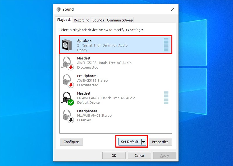 Bước 2: Mở tab tab Playback và chọn tai nghe đầu tiên làm thiết bị phát lại mặc định của bạn. Click vào tai nghe và chọn Set Default