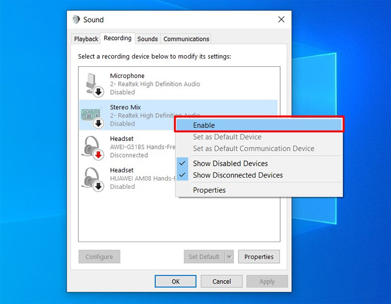 Bước 3: Tiếp đến huyển đến tab Recording. Nhấp chuột phải vào Stereo Mix và nhấn Enable