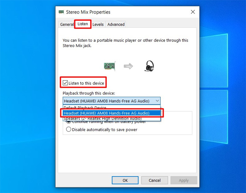 Bước 4: Nhấp đúp chuột vào Stereo Mix để mở Properties >> Chọn tab Listen >> Chọn khung Listen to this device và chọn loa từ danh sách thả xuống