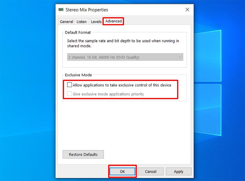Bước 5: Mở tab Anvanced >> Bỏ chọn Allow apAllow applications to take exclusive control of this device >> Chọn Apply hoặc OK