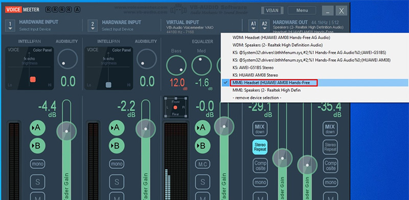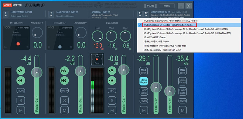 Từ chữ A1 bên góc phải màn hình, chọn WDM hoặc MME đối với thiết bị phát thứ nhất của mình.Sau đó tiếp tục nhấn vào A2 bên cạnh, chọn WDM hoặc MME đối với thiết bị còn lại. Các thiết bị phát cả thể là tai nghe, loa bluetooth, loa USB,...Và bây giờ bạn có thể vừa nghe nhạc trên cả loa và tai nghe của mình