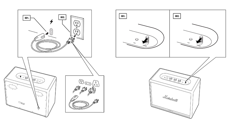 - Nếu loa marshall chạy bằng nguồn điện, hãy cắm 1 đầu cáp nguồn vào loa và cắm một đầu cáp còn lại vào nguồn điện, sau đó gạt công tắc nút nguồn để bật loa