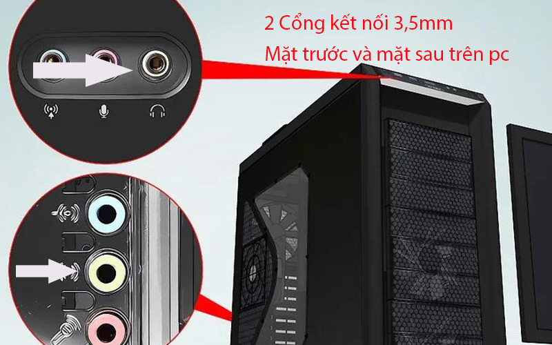 - Cắm giắc cắm 3,5mm vào cổng có biểu tượng tai nghe nhỏ hoặc line out (màu vàng mắt sau pc).