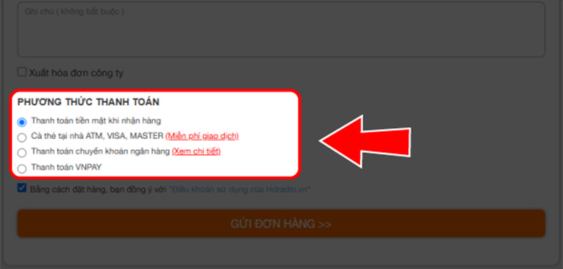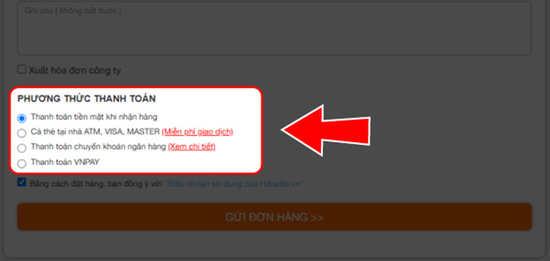Nhằm hỗ trợ tối đa cho khách hàng trong việc nhanh chóng sở hữu các sản phẩm của HDRADIO phân phối. Công ty hỗ trợ rất nhiều các hình thức thanh toán đa dạng như sau: