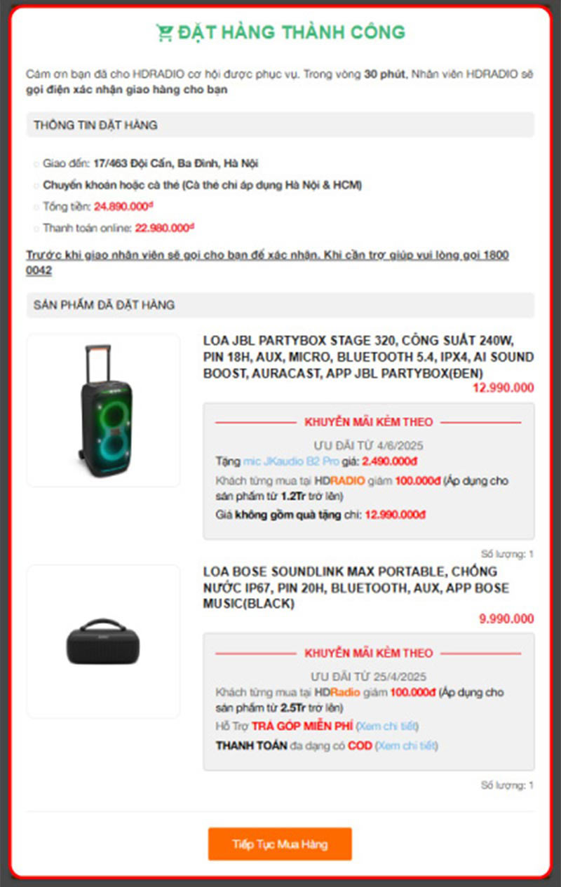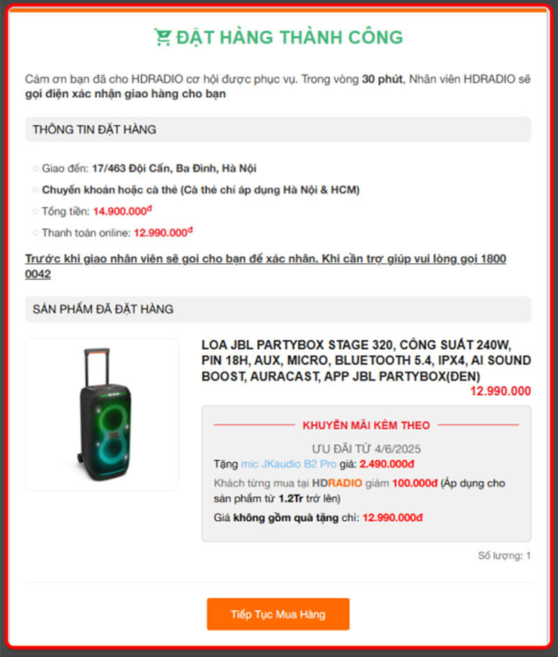 Sau đó HDRADIO sẽ gửi đến bạn một thông báo đặt hàng thành công.