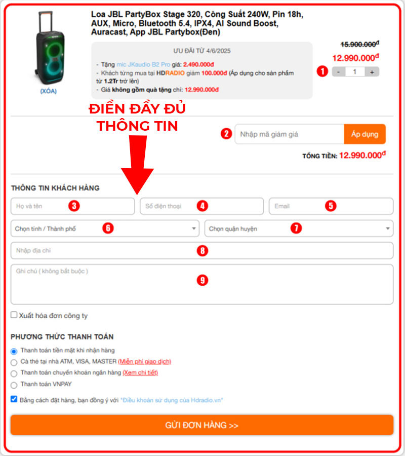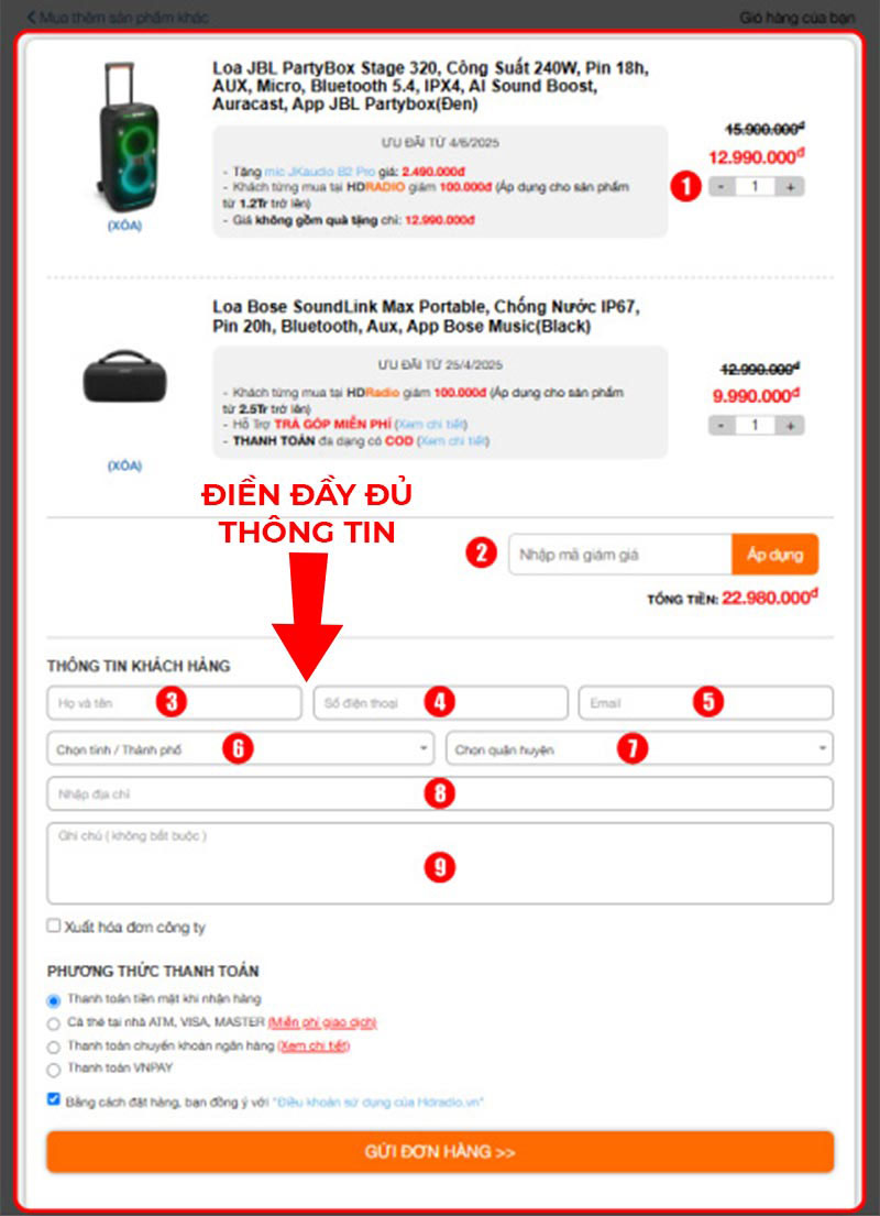 - Số 8 : Nhập địa chỉ mà HDRADIO có thể giao hàng cho bạn