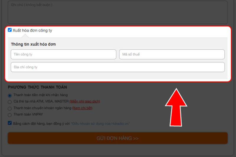 Nếu bạn muốn Xuất hóa đơn vui lòng tích chọn "Xuất hóa đơn công ty" sau đó điền đầy đủ thông tin bao gồm: Tên công ty, mã số thuế và địa chỉ công ty.