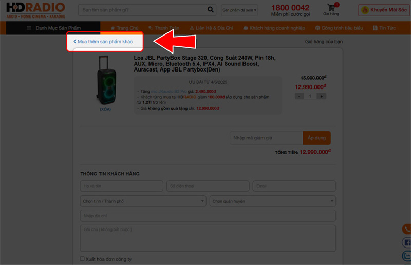 Ngoài ra, bạn cũng có thể nhấn "Tiếp Tục Mua Hàng" để quay về trang chủ và chọn mua các sản phẩm khác của HDRADIO